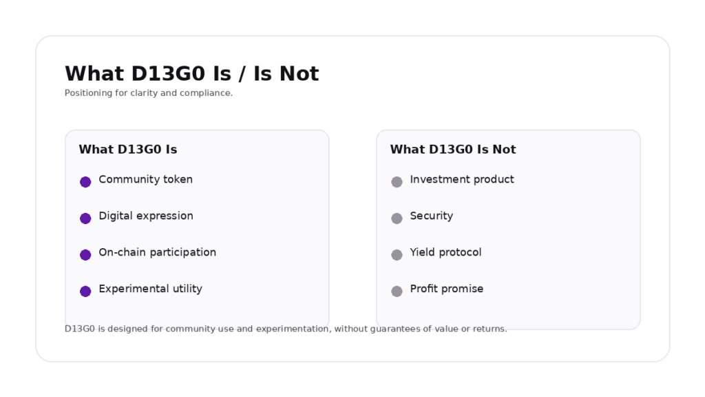 D13G0 is designed as a community token, not as a financial product.